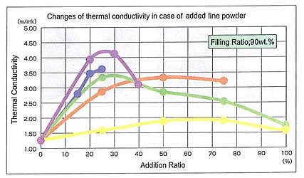As a filler for thermal conductive sheets, in particular, alumina is very popular since it is comparatively inexpensive and offers high thermal conductivity. Because of the spherical nature of these powder particles, it is possible to easily enhance the packing density of the filler. In addition, by controlling the particle size distribution with a combination of two or more types of spherical alumina, it is possible to improve the thermal conductivity of the filler.